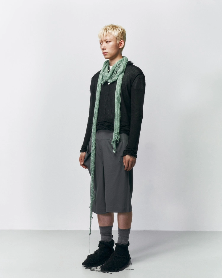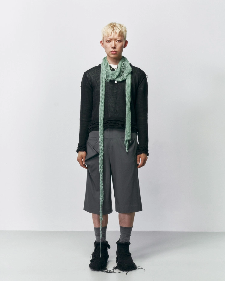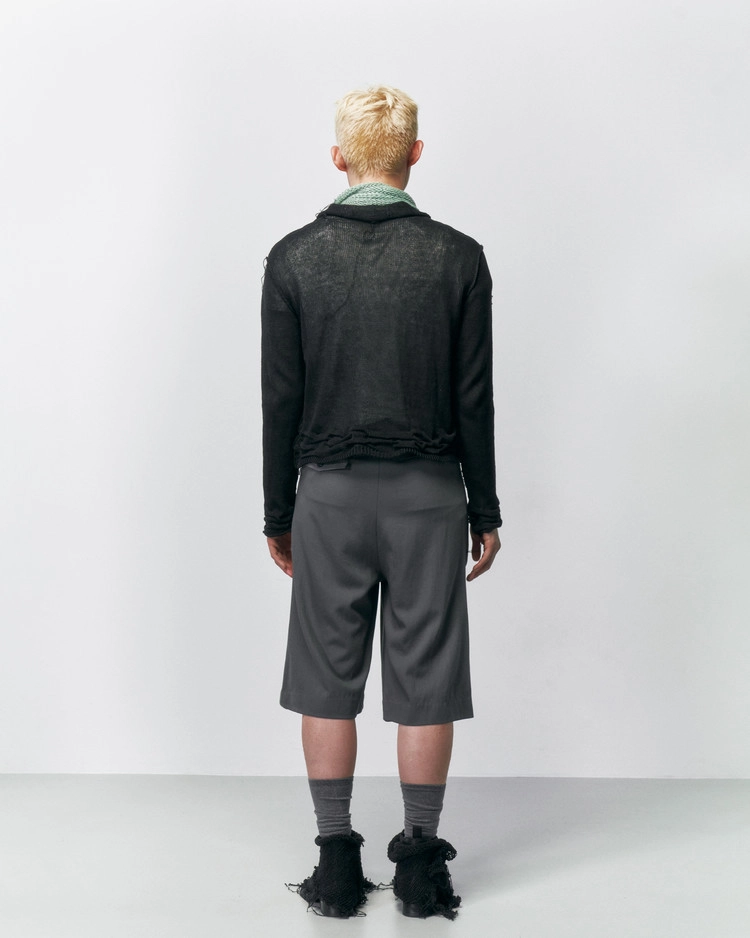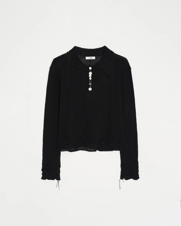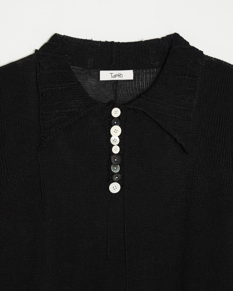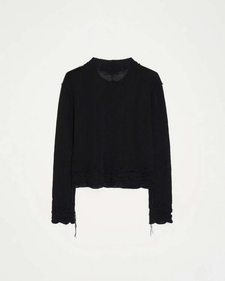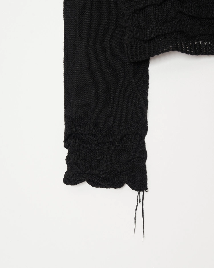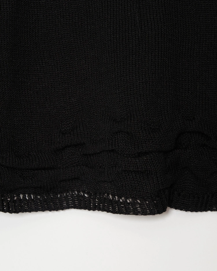 디스트레스 니트의 블랙 버젼 입니다. 면 원사를 사용해 시원히지만 부드러운 짜임의 촉감이 특징입니다.
