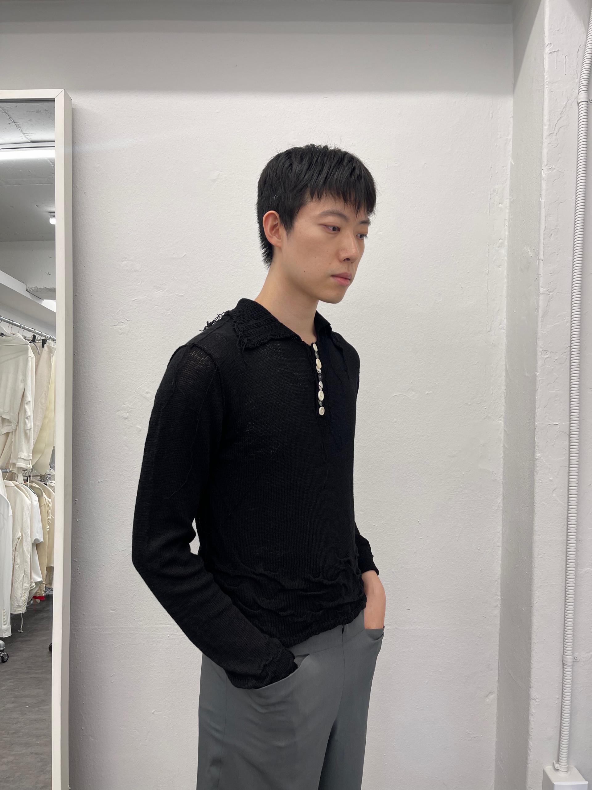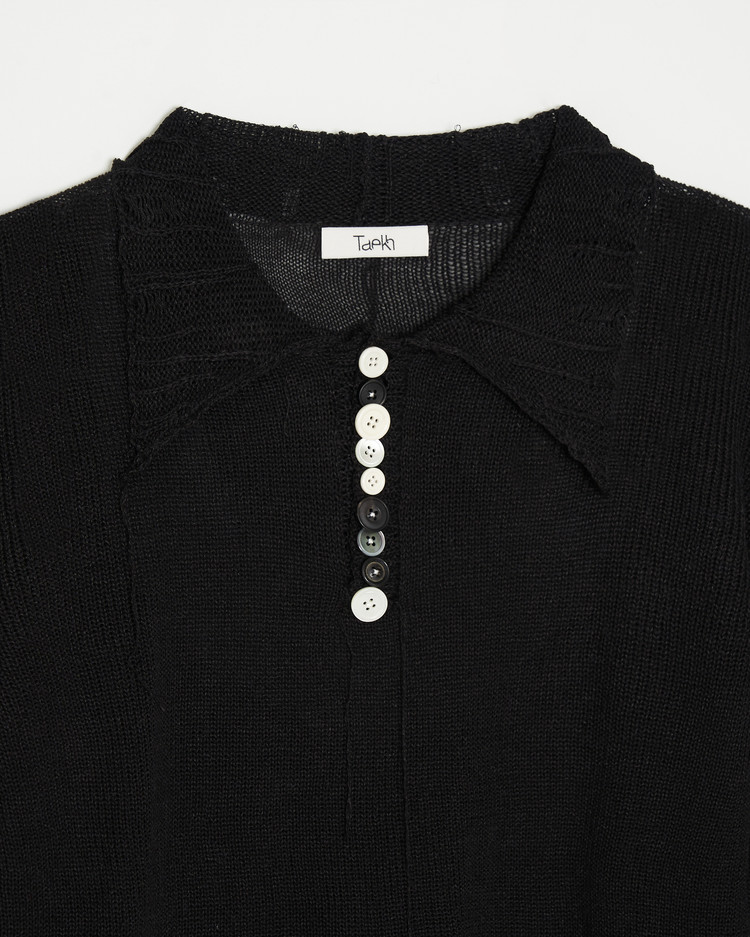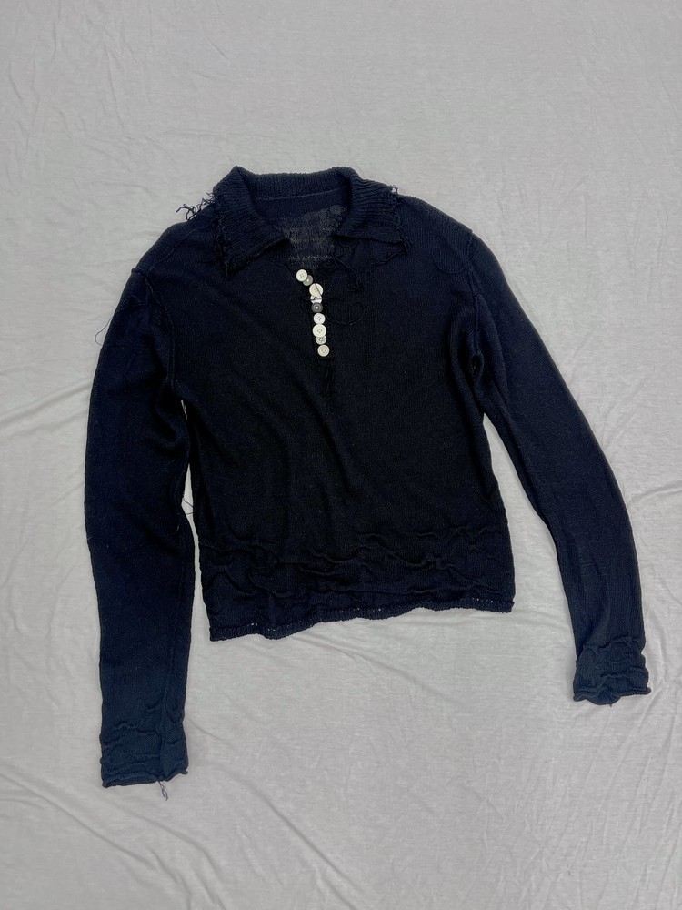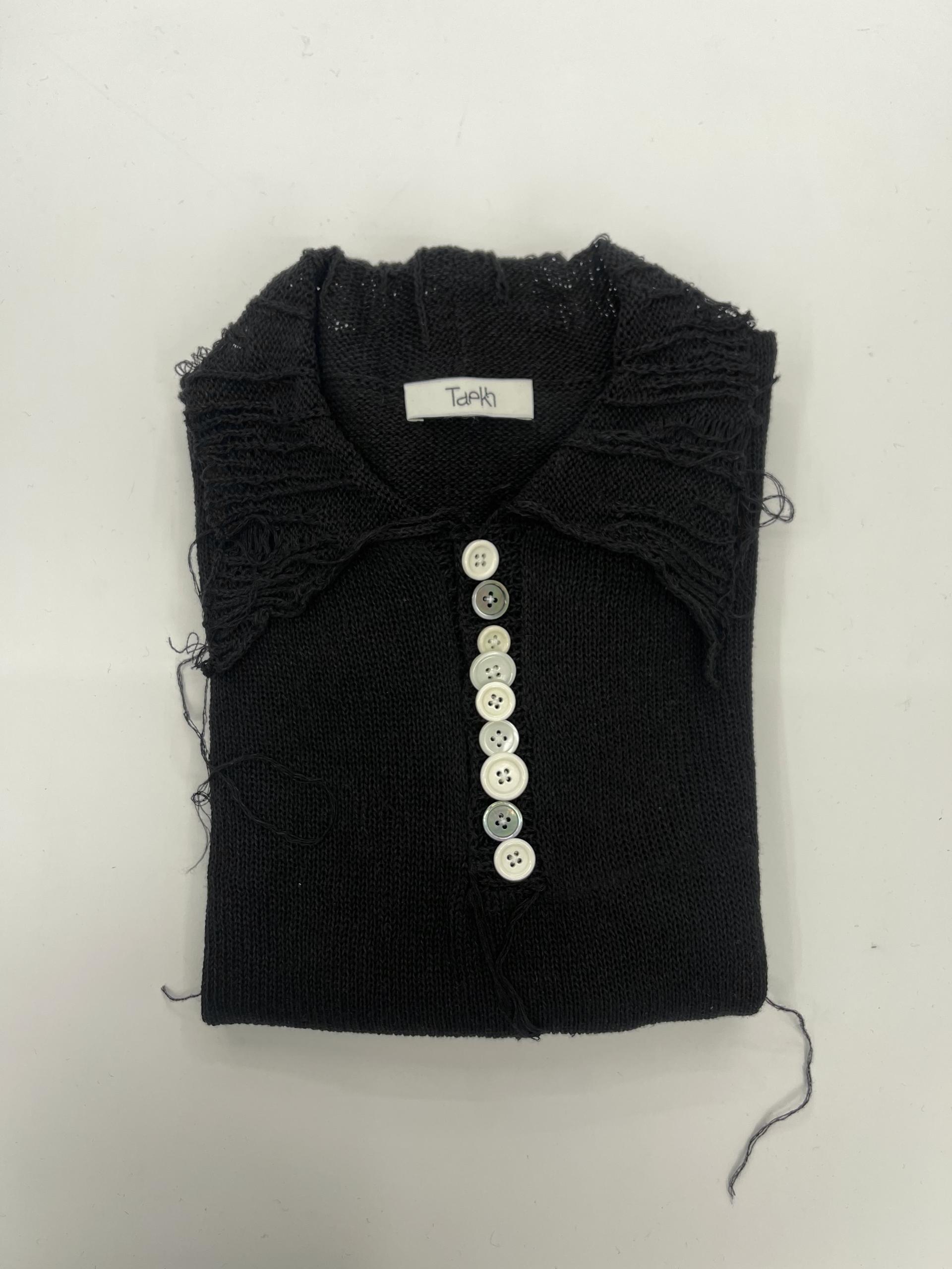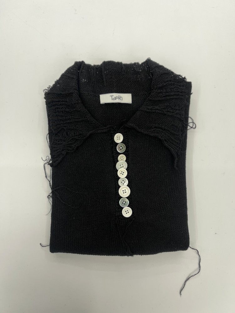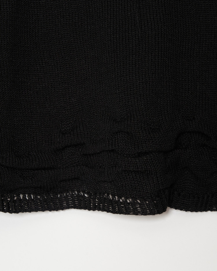 여름용으로 제작된 디스트레스 니트의 블랙 버젼 입니다. 써머 울, 린넨 혼방 원사를 사용해 시원한 짜임의 촉감이 특징입니다.