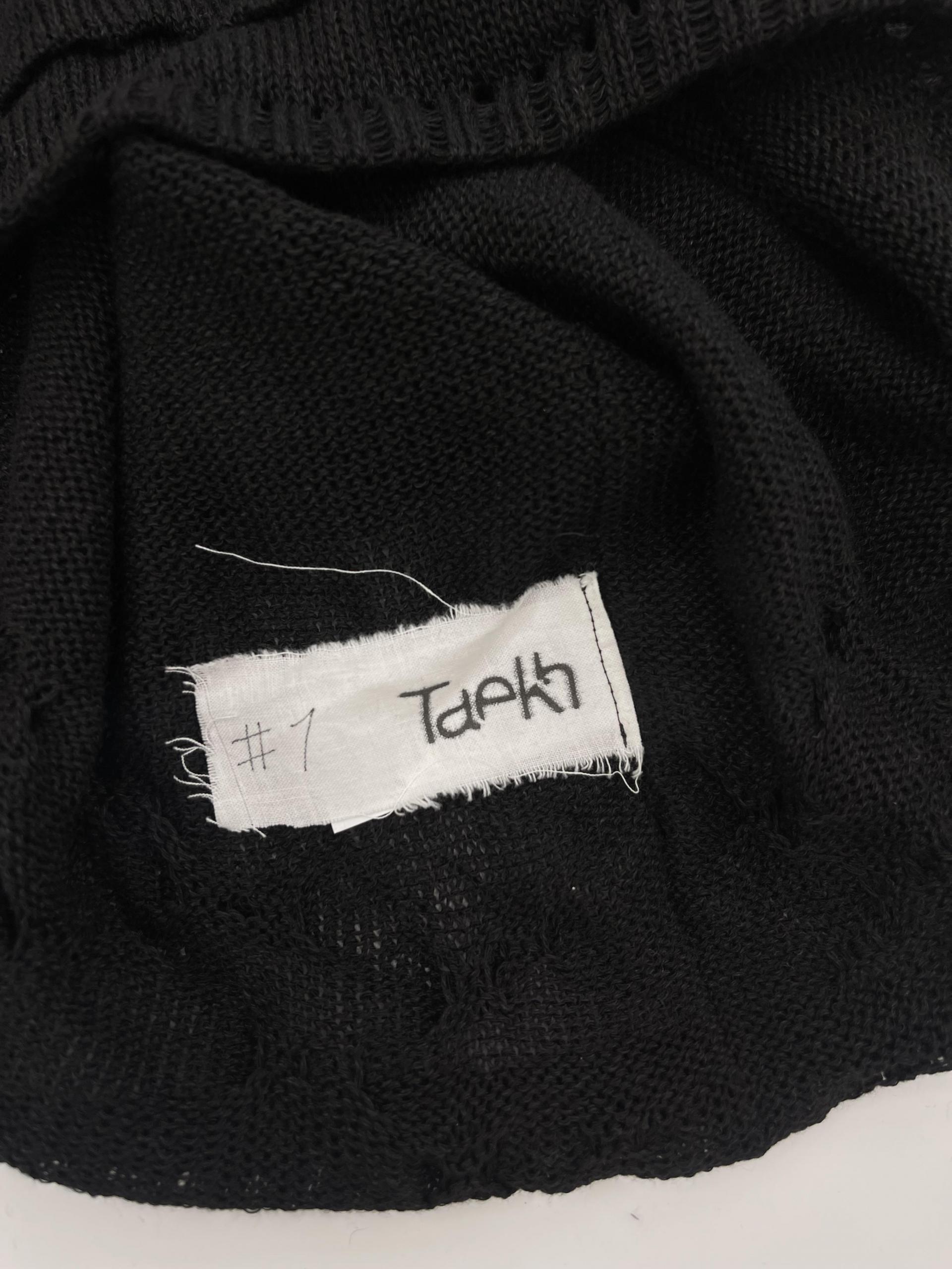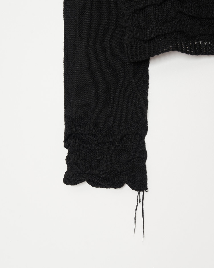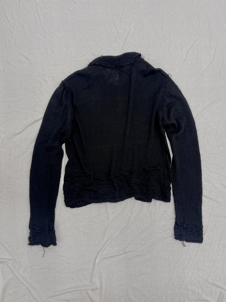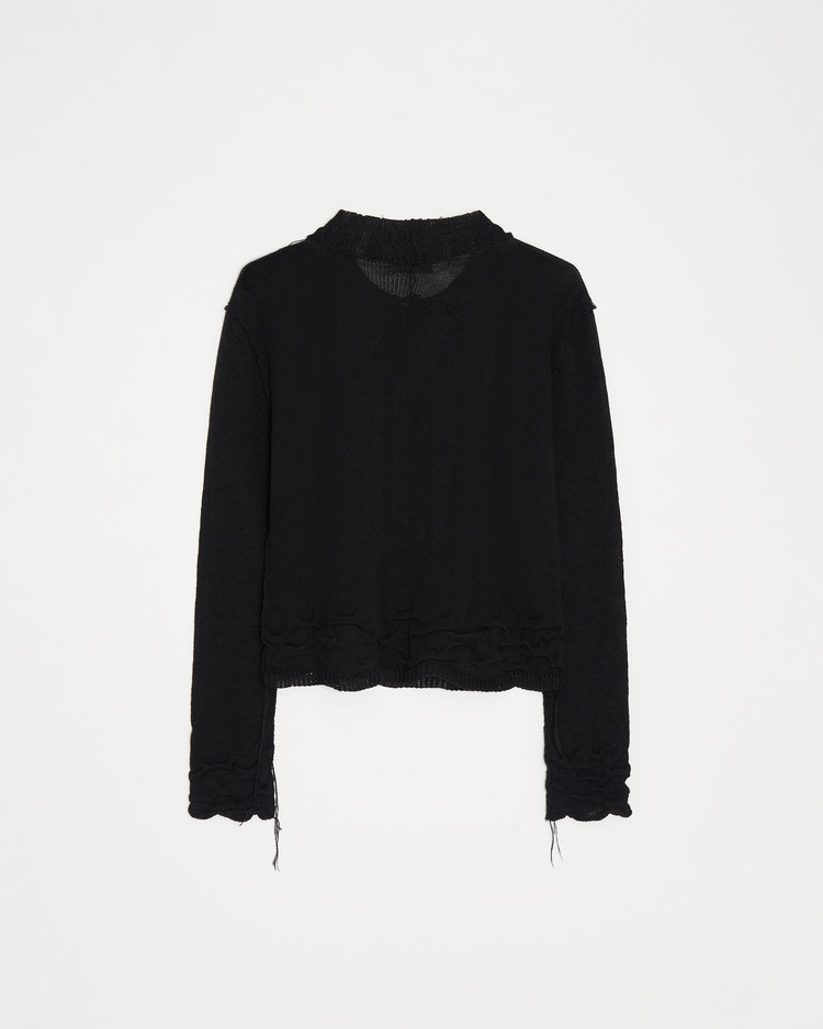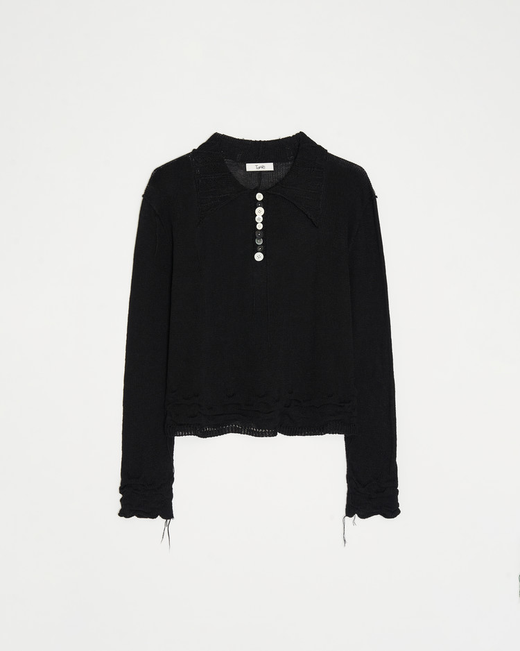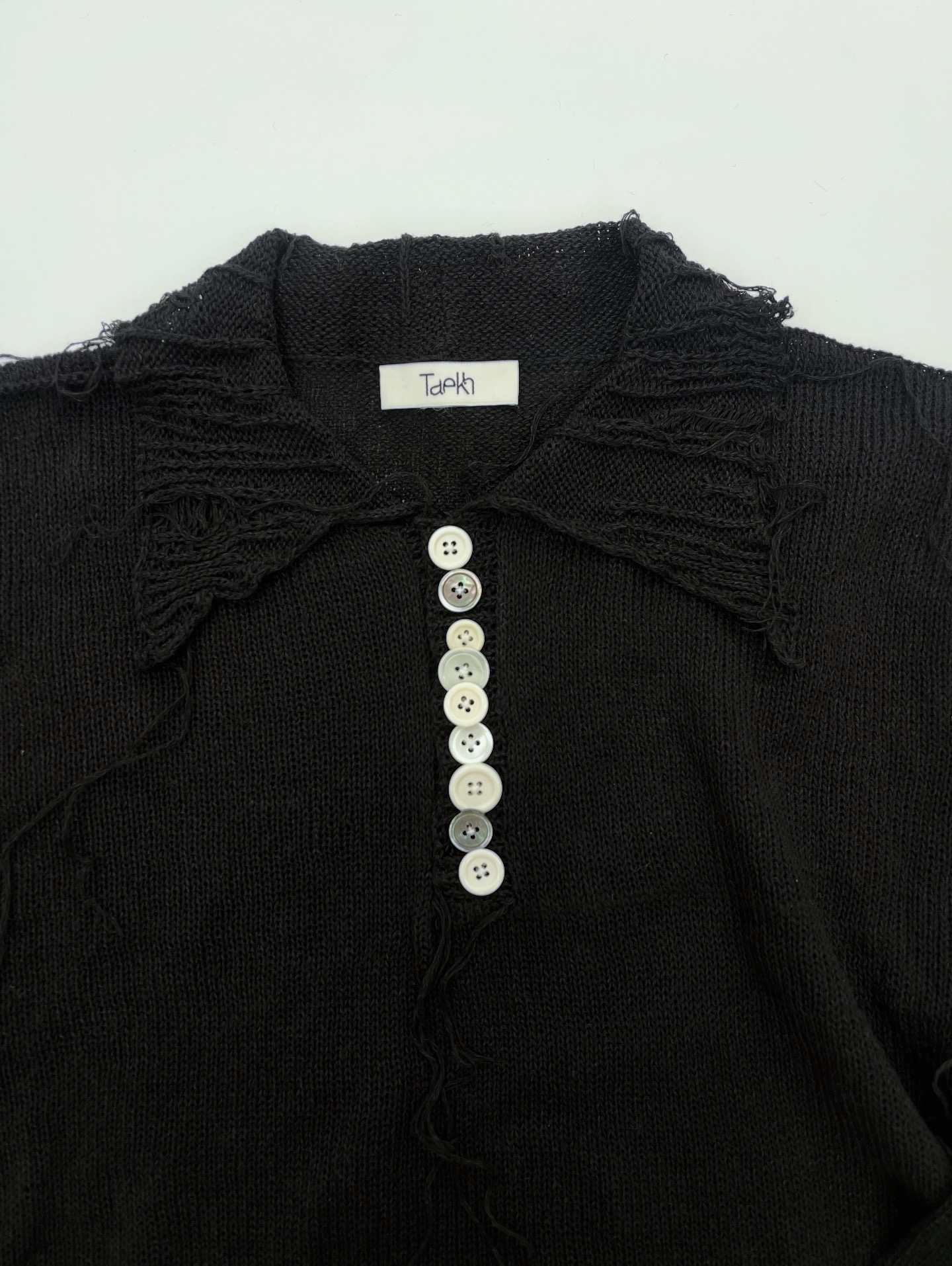 여름용으로 제작된 디스트레스 니트의 블랙 버젼 입니다. 써머 울, 린넨 혼방 원사를 사용해 시원한 짜임의 촉감이 특징입니다.