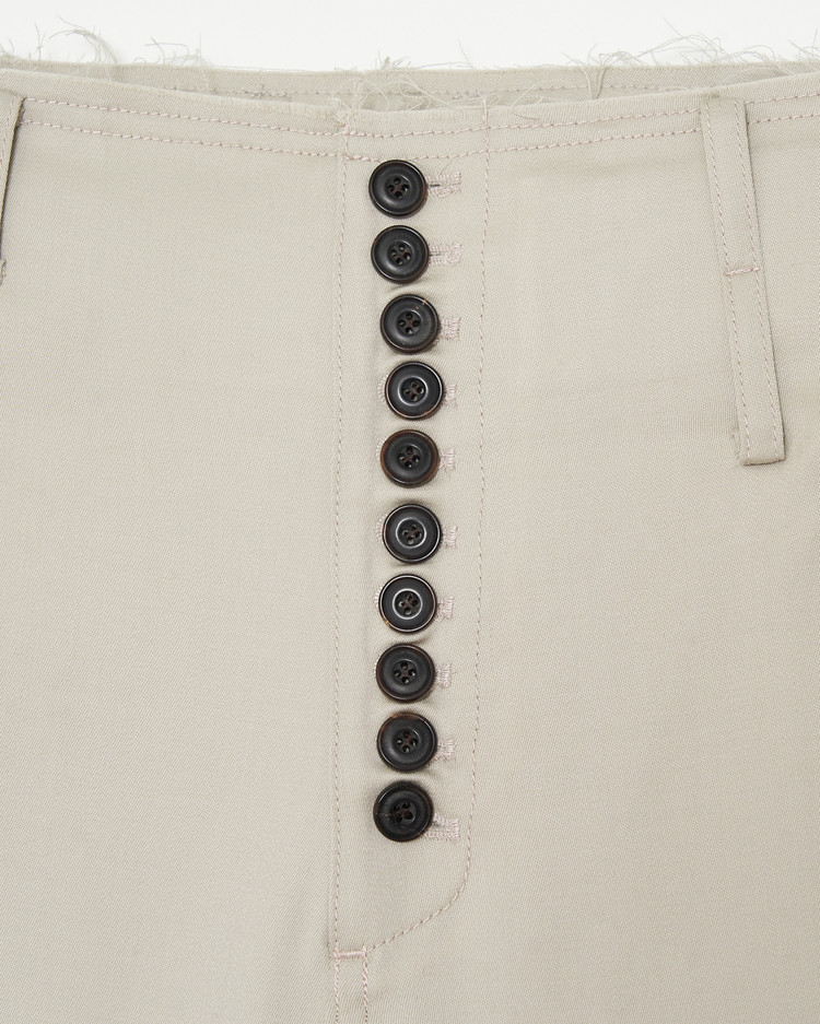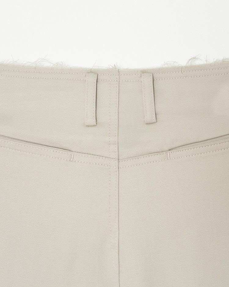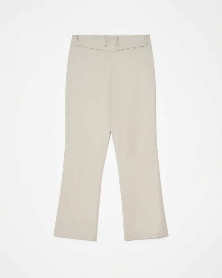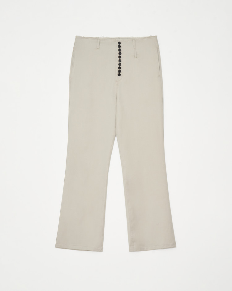 뒷판의 요크, 스티치 디테일 등 데님팬츠에서 찾아볼 수 있는 특징들을 이탈리안 울 팬츠로 제작했습니다. 깔끔한 부츠컷과 탈색 소뿔단추, 올이 풀리도록 마감된 허리가 특징입니다. 디스트레스드 울 트러커 자켓과 셋업으로 착용가능합니다.