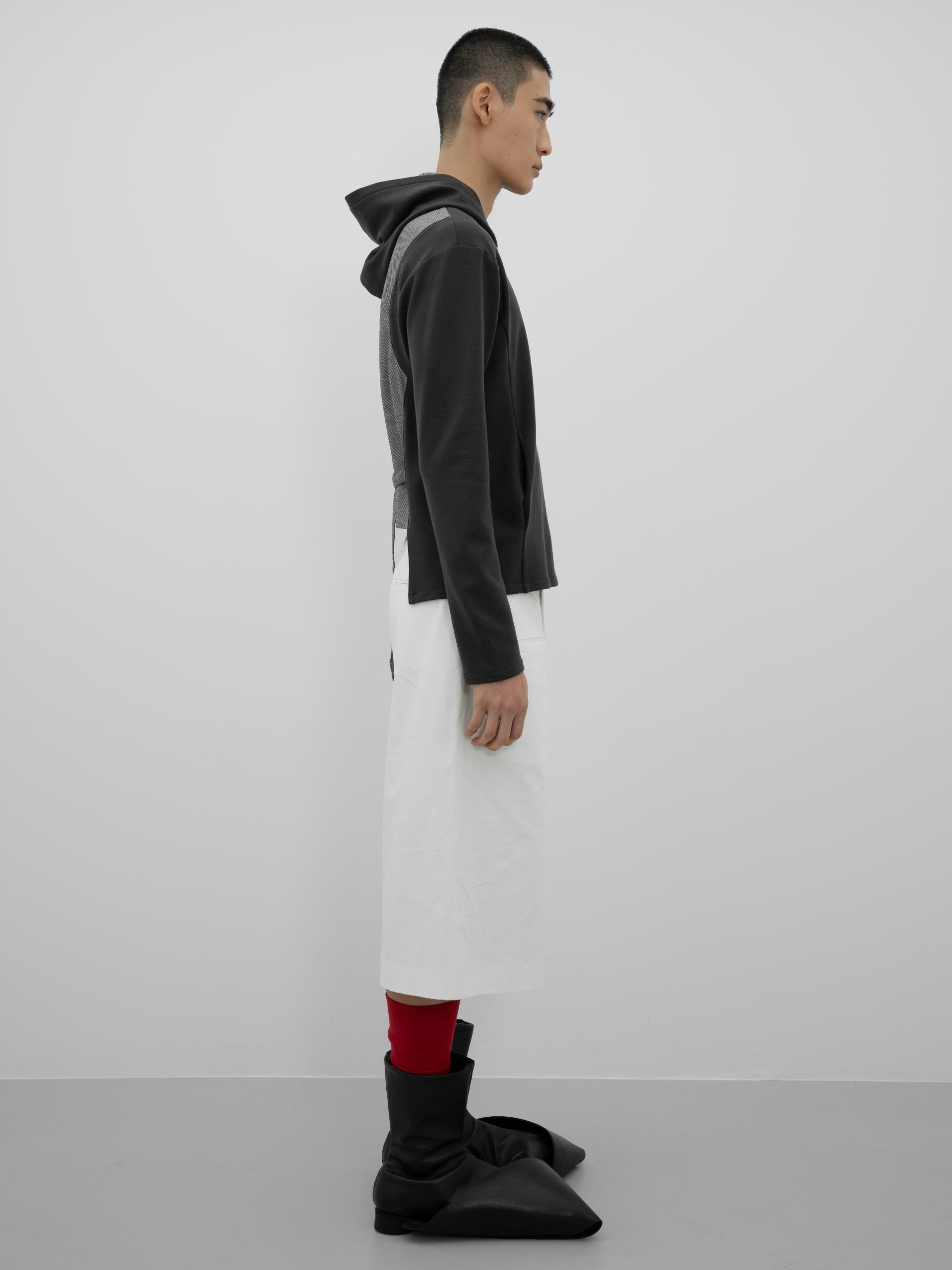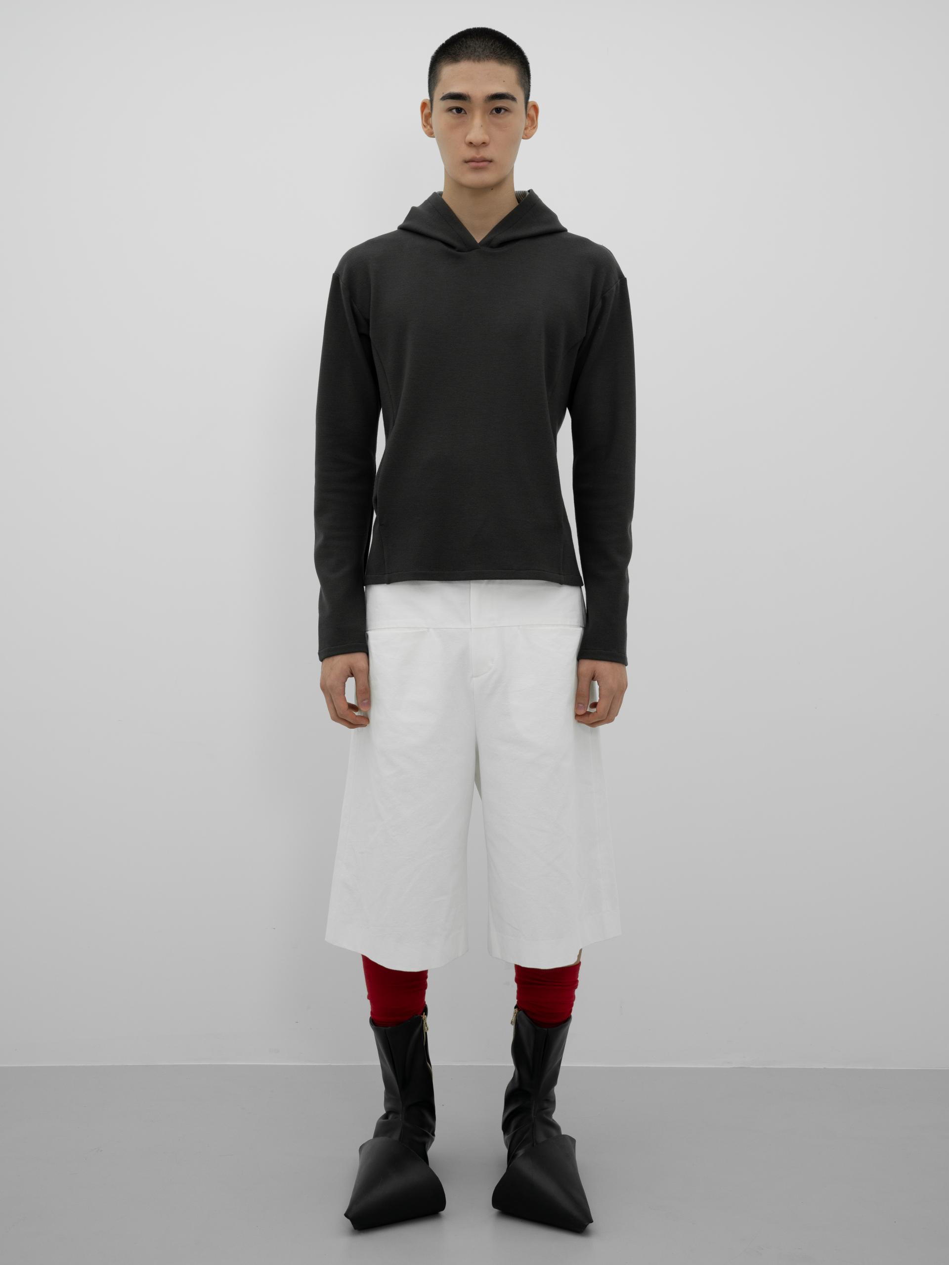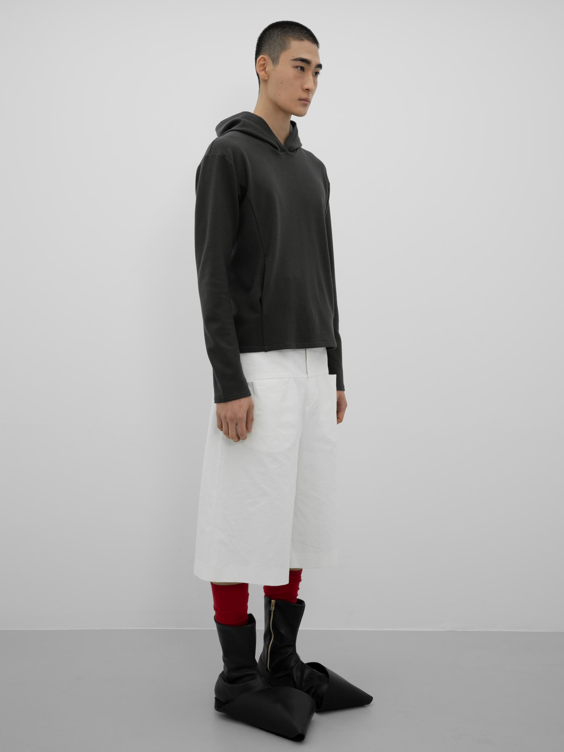 포켓에 변주를 준 와이드 핏의 반바지입니다. 두께감있는 10수 화이트 코튼으로 제작되었습니다.