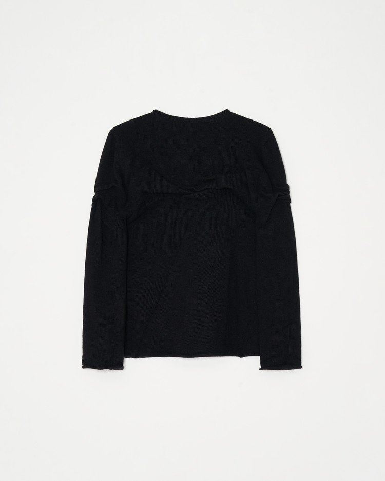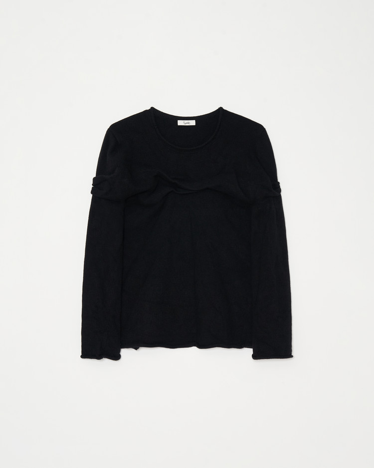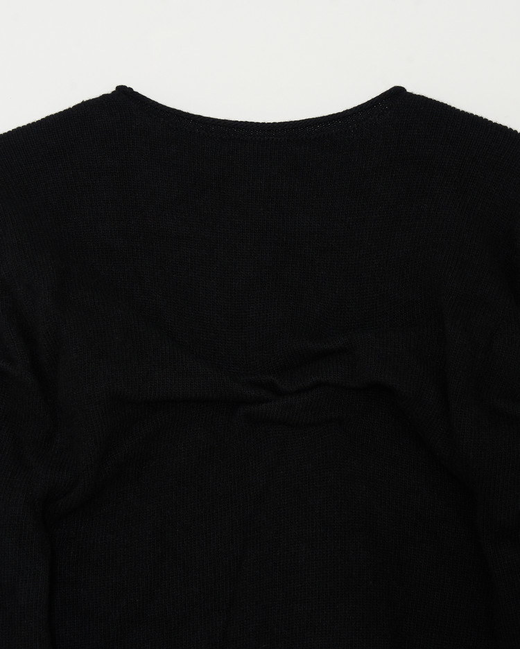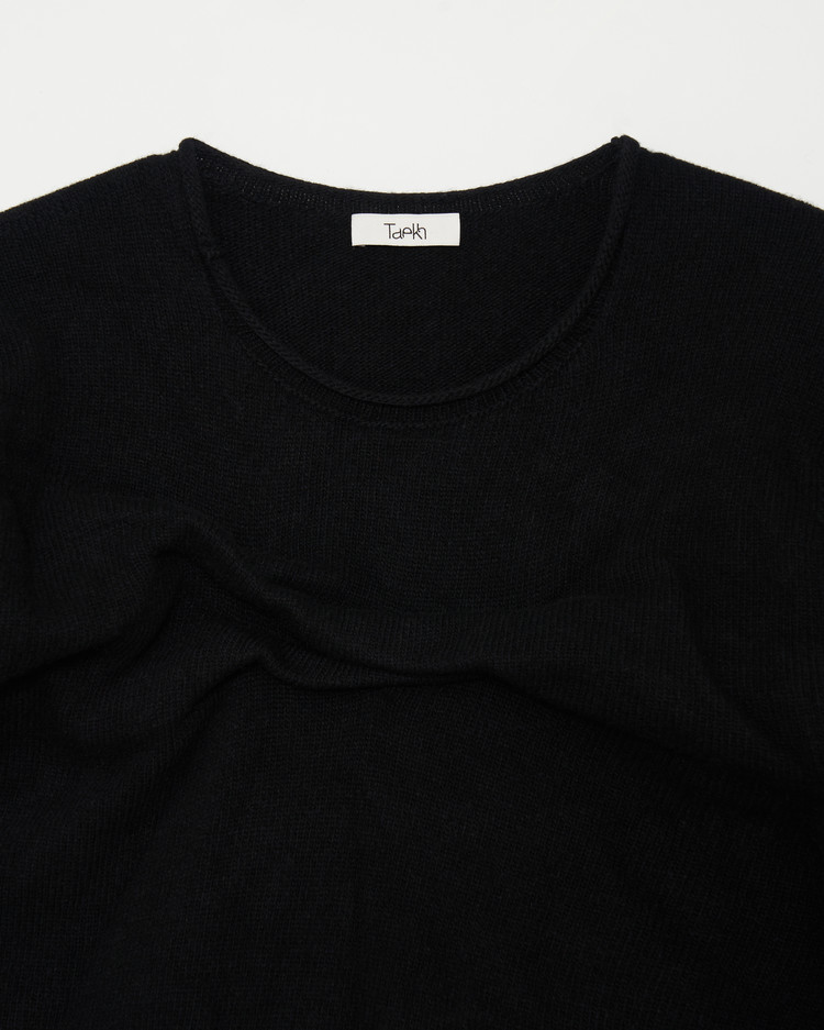 글리치 드레이프 탑의 니트 블랙 버젼 입니다. 캐시미어 울 혼방의 원사로 제작되어 부드럽고 따뜻한 보온성이 특징입니다.